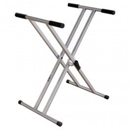 - Stand double barre. - Serrage central en aluminium crante avec repere des 2 principales hauteurs utilisees. - Poignees Long SAFE- GRIP. - Charge maximale : 110kg. - Hauteurs reglables de 20 a 98cm. - 4 Tube acier 25 x 25 x 1.5mm. - Longueur des bras 49 cm, diametre 30 mm. - Poids 7 kgs. - Couleur Titanium. - Peut recevoir les options XRX/T pour 2eme clavier.